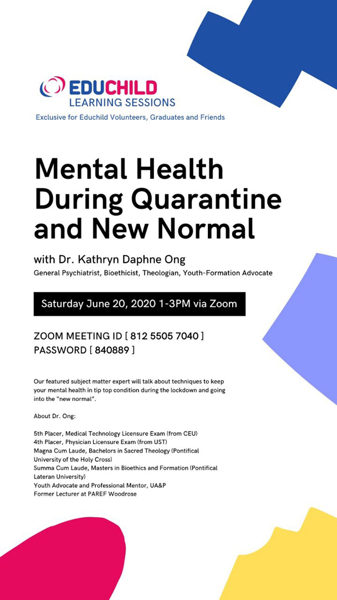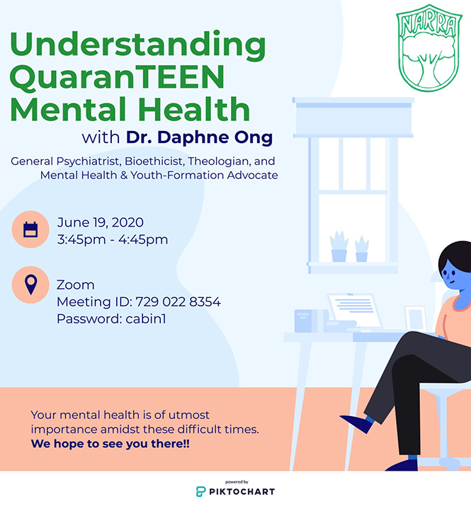 Join the discussion with Dr. Daphne Ong who will share techniques on how to keep your mental health in tip top condition during the lockdown and going into the “new normal.” Dr. Ong is a psychiatrist, bioethicist, theologian, and youth-formation advocate. We invite you to attend one or or attend both of her sessions:
