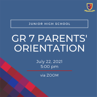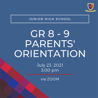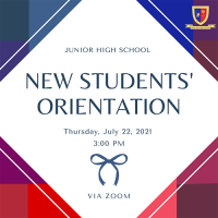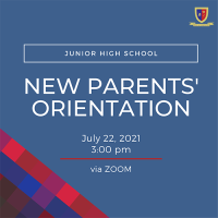 The Junior High School Department invites NEW STUDENTS, NEW PARENTS, and incoming Grade 7 to 10 PARENTS to their respective orientations for SY 2021-22 happening between July 22-23 via ZOOM. Please refer to the following dates and times for your group’s specific schedule.