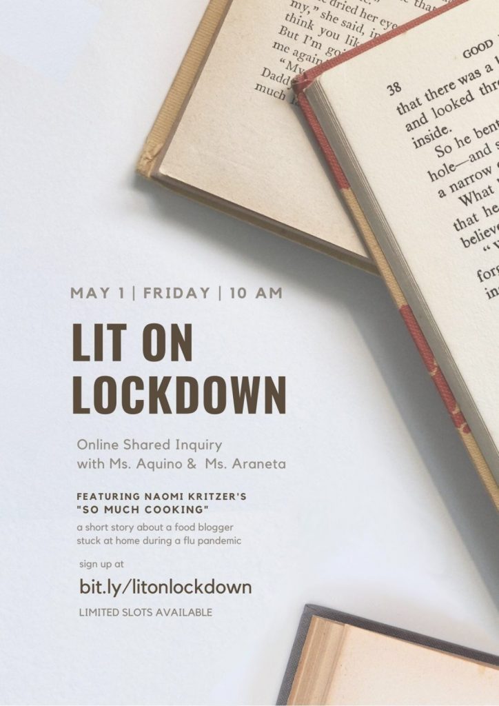 Don’t let this lockdown stop you from loving literature! Join English teachers, Ms. Aquino and Ms. Araneta, for an online discussion on Naomi Kritzer’s So Much Cooking, a short story about a food blogger stuck at home during a flu pandemic. This will be held on Friday, May 1, 2020, at 10am. Sign up at here.