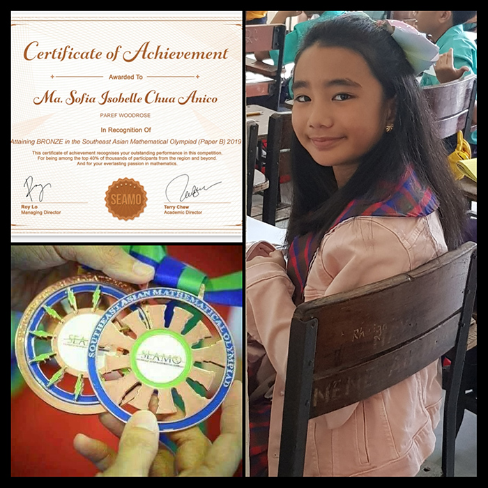 Congratulations to BELLA ANICO for attaining Bronze in the South East Asian Mathematical Olympiad (SEAMO) conducted here in the Philippines on September 21, 2019. The Certificate of Achievement awarded to Bella recognizes her as “among the top 40% of thousands of participants from the region and beyond.” This qualifies her to participate in the SEAMO X 2020 Global Round to be held in Gold Coast, Australia from January 17 to 20.